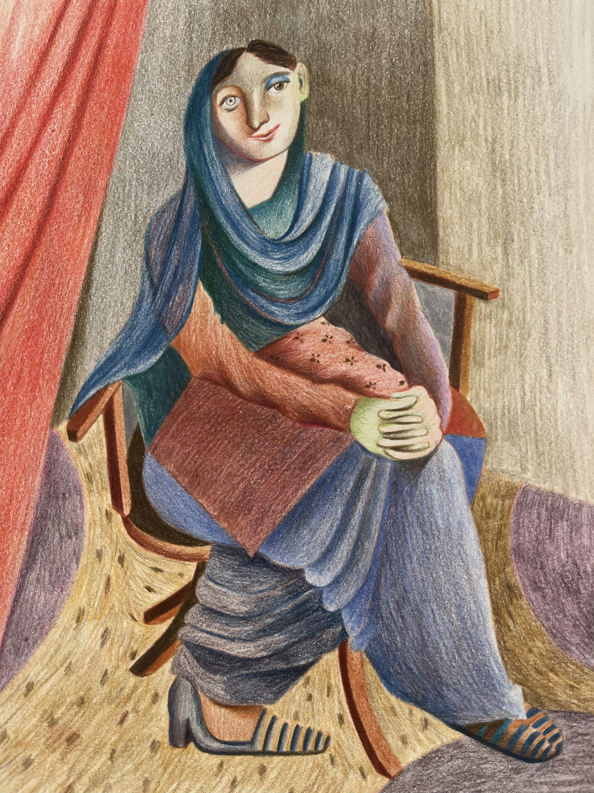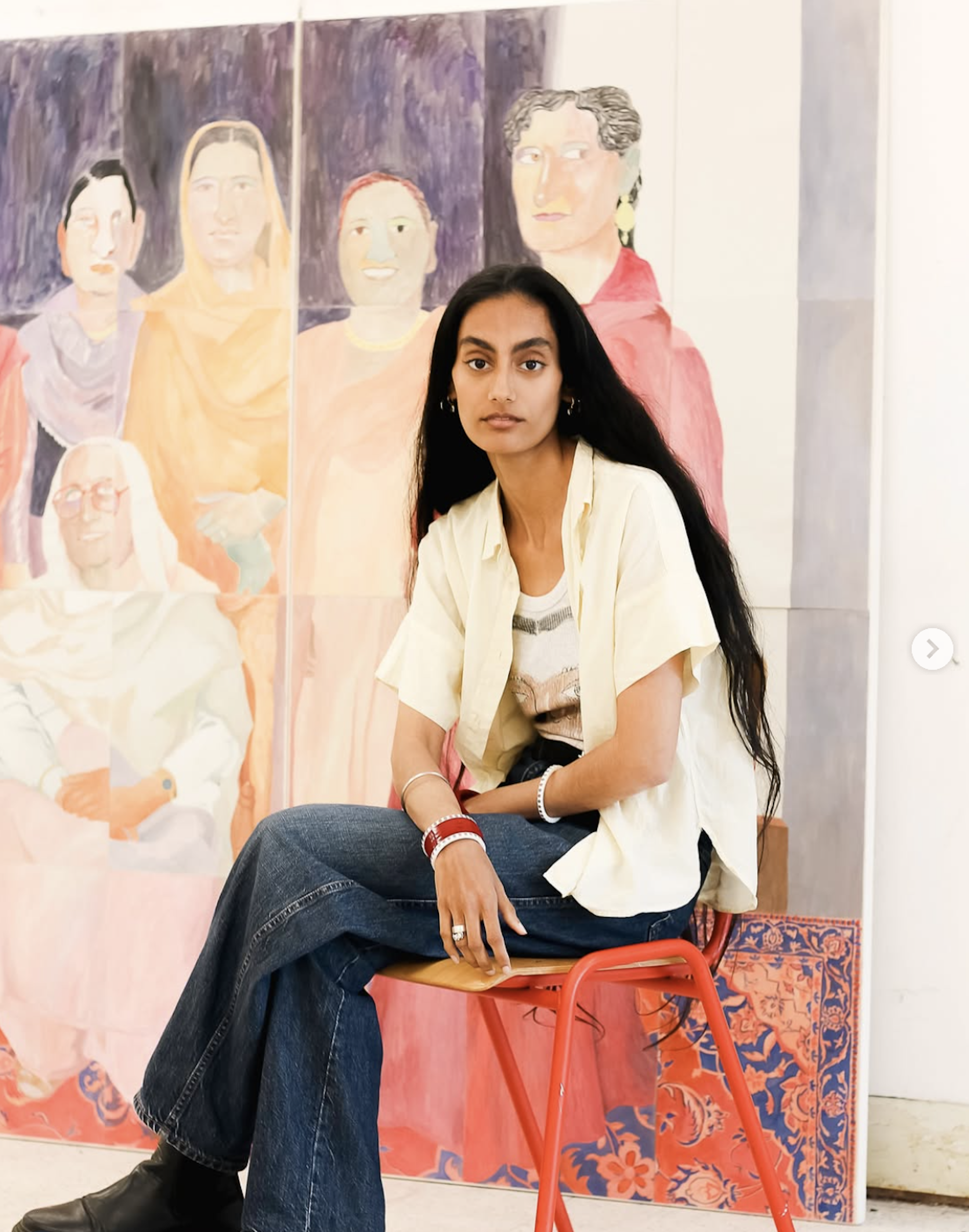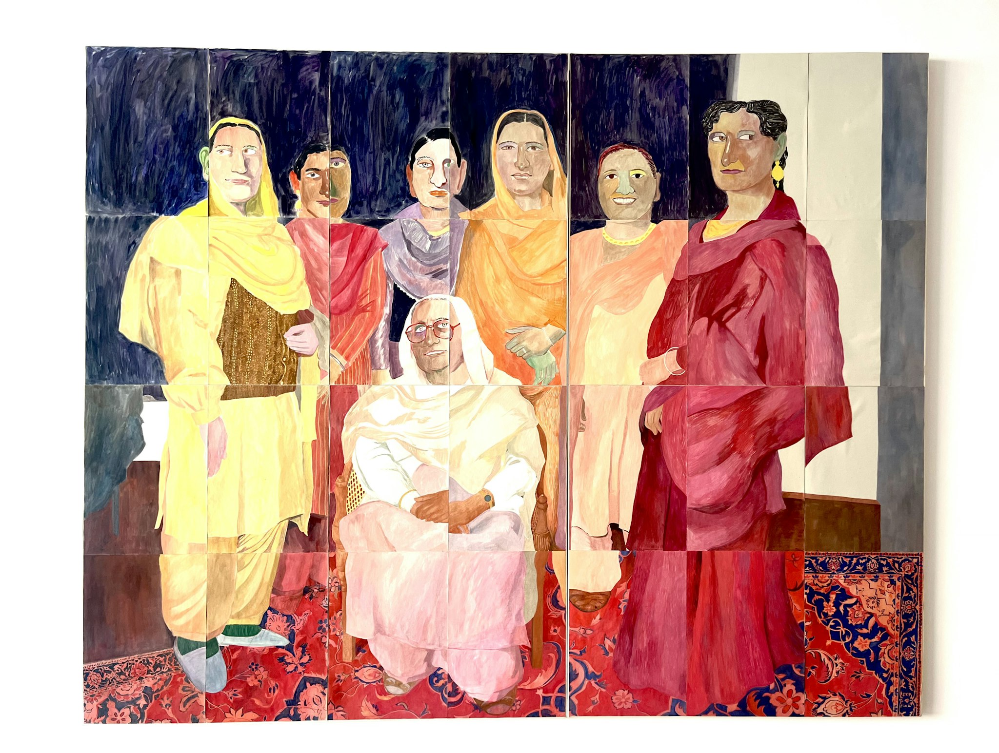 Influenced by David Hockney’s energetic and dynamic colour combinations, Amrit reimagines black and white family photos to create histories for people known and unknown, touching on her feelings of groundedness and connections to the present. Her compositions are often reminiscent of the austerity and compositions of a classical Italian fresco, yet they exude a certain playfulness in their abstraction of faces and forms. This allows Amrit to explore her own personal and cultural associations with style, fabric, and family lineage as a way to channel stories and conjure pieces of home.
