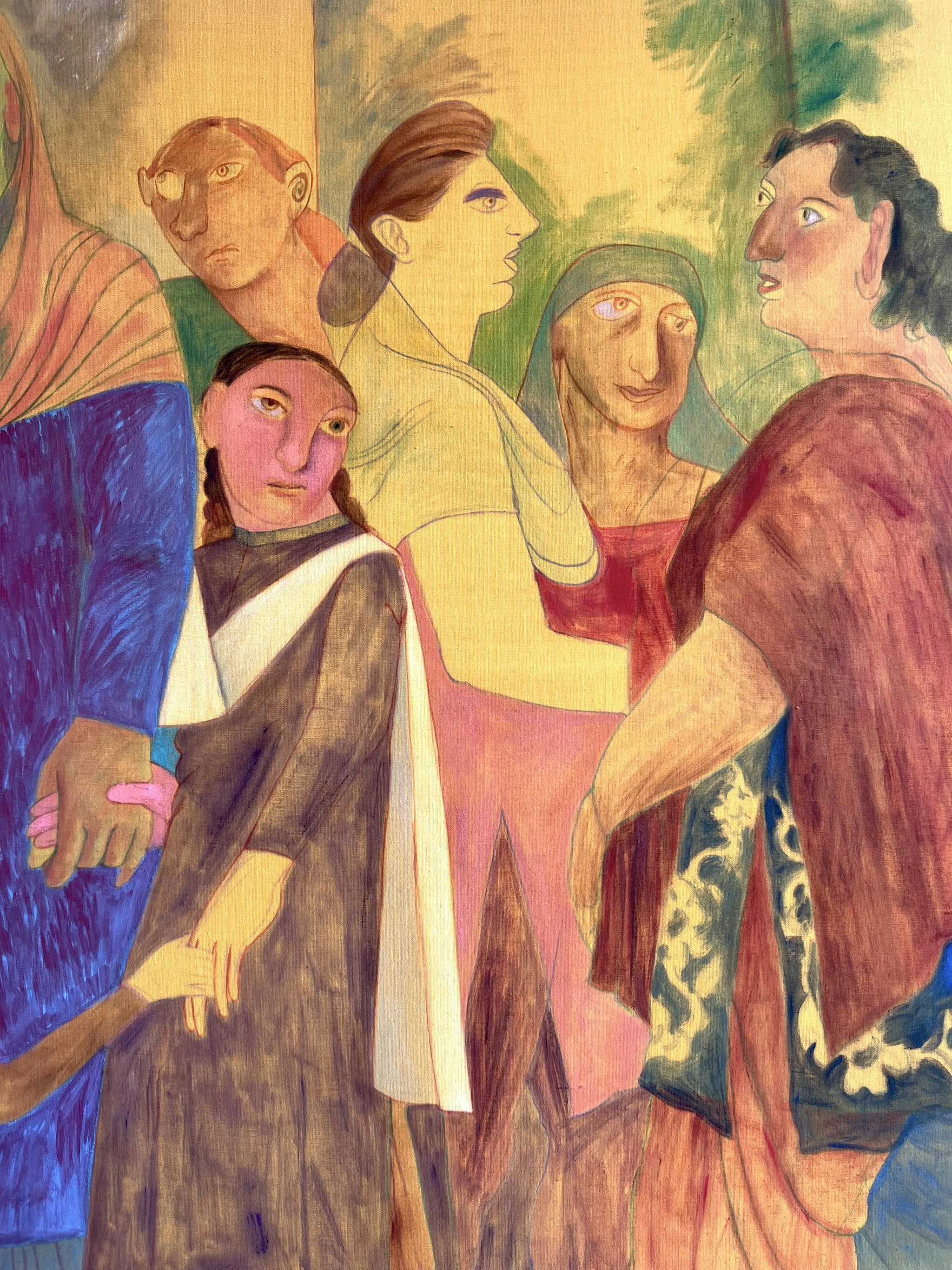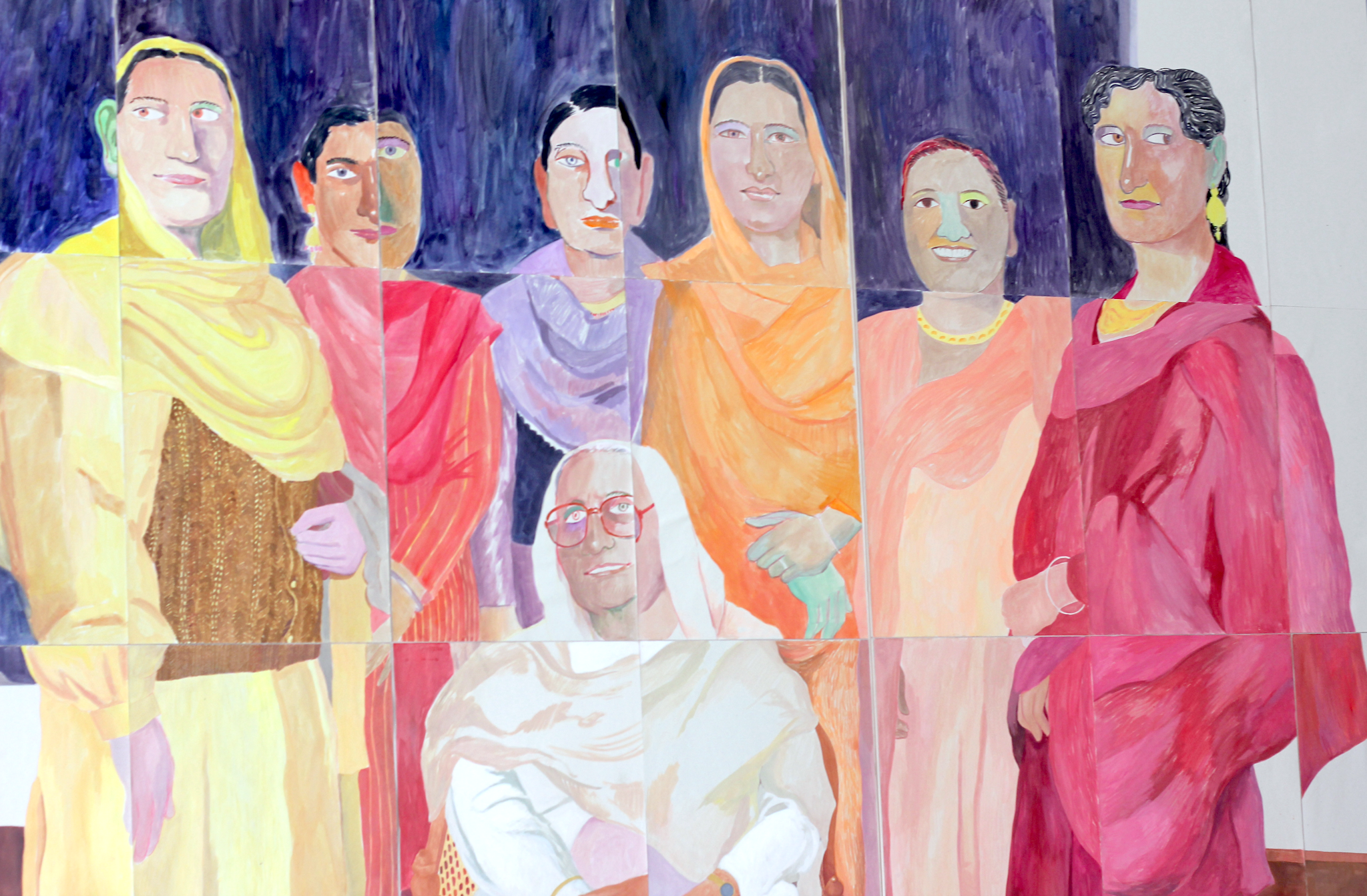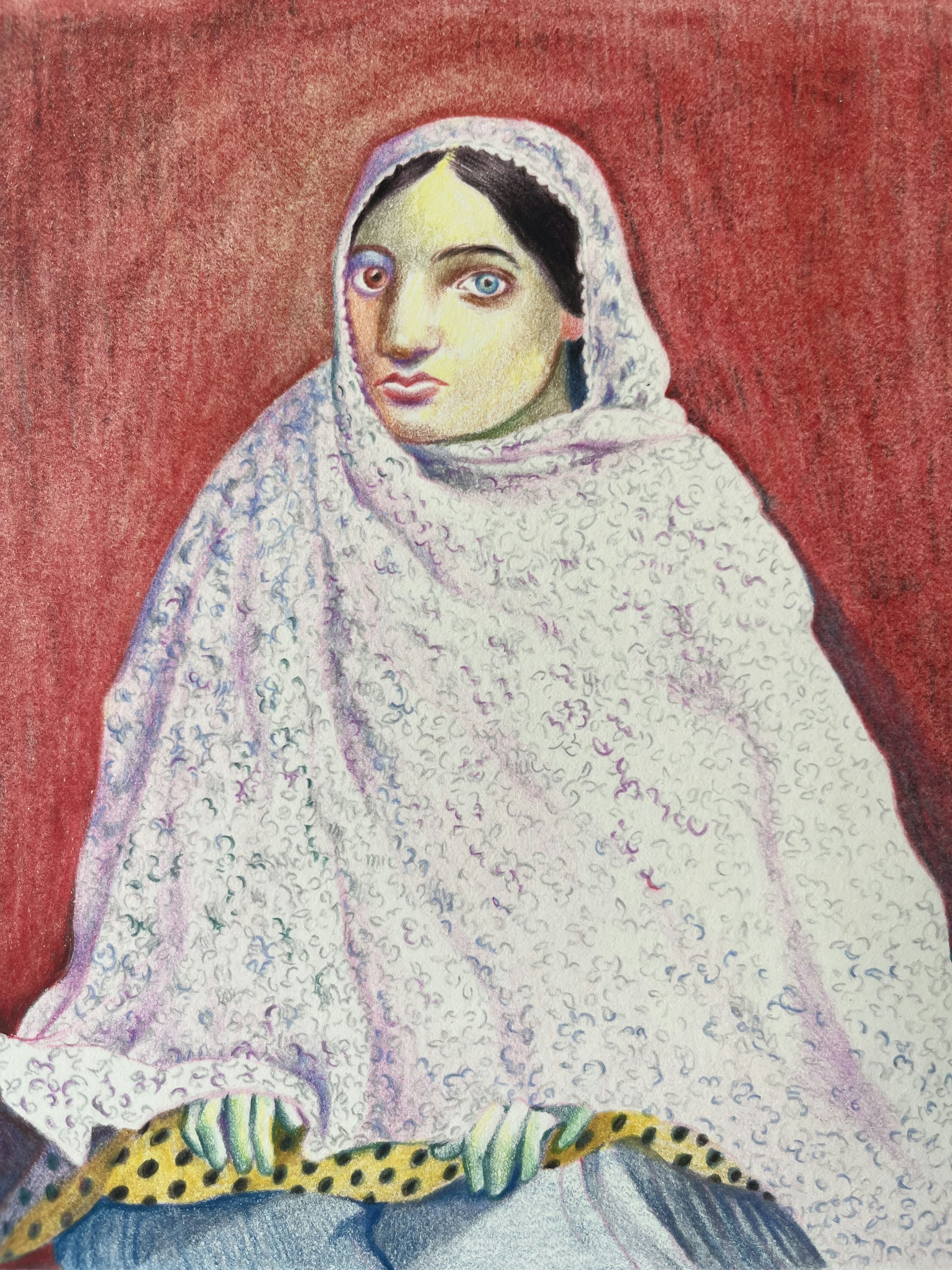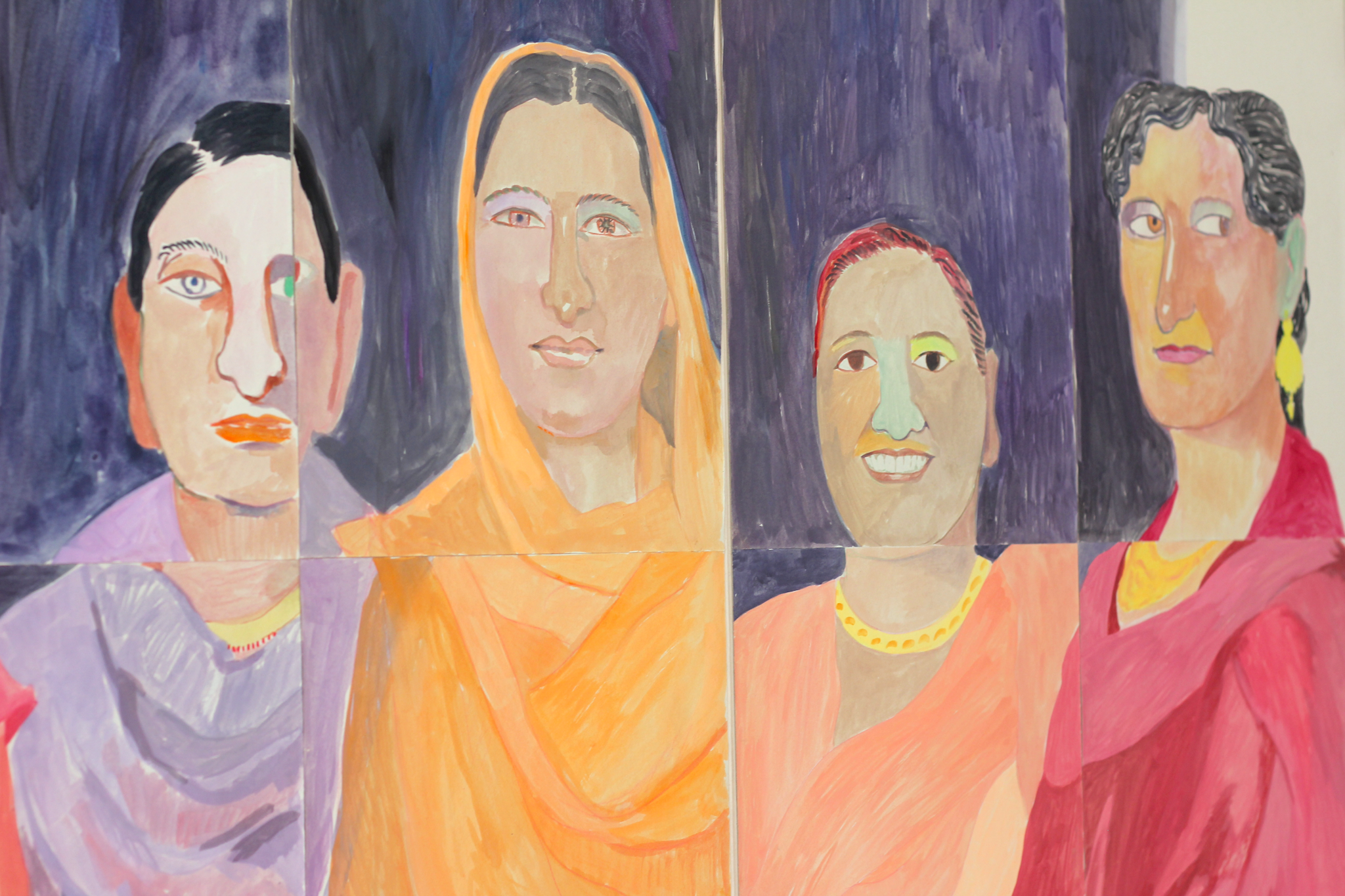 Influenced by David Hockney’s energetic and dynamic colour combinations, Amrit reimagines black and white family photos to create histories for people known and unknown, touching on her feelings of groundedness and connections to the present. Her compositions are often reminiscent of the austerity and compositions of a classical Italian fresco, yet they exude a certain playfulness in their abstraction of faces and forms. This allows Amrit to explore her own personal and cultural associations with style, fabric, and family lineage as a way to channel stories and conjure pieces of home.
