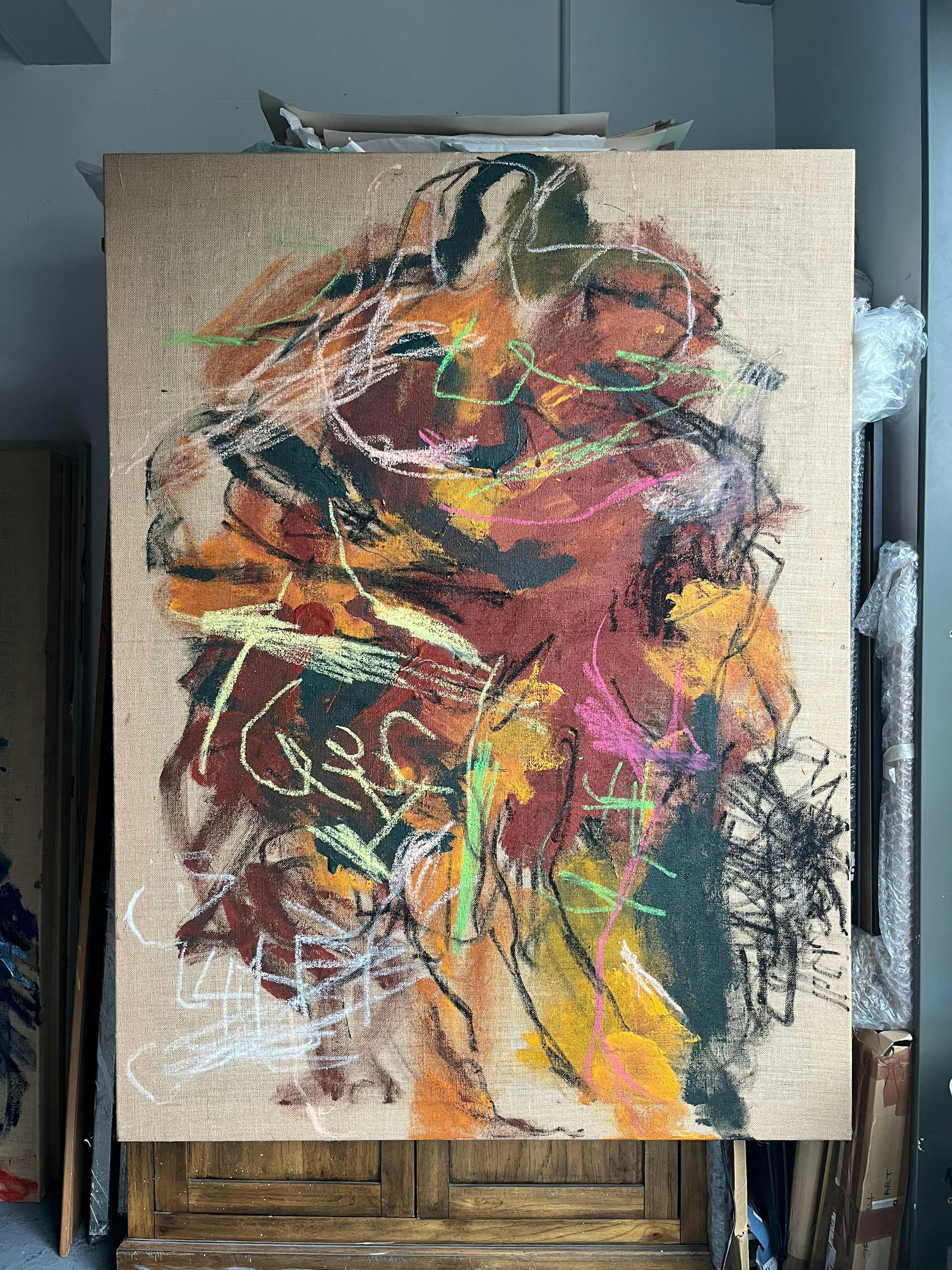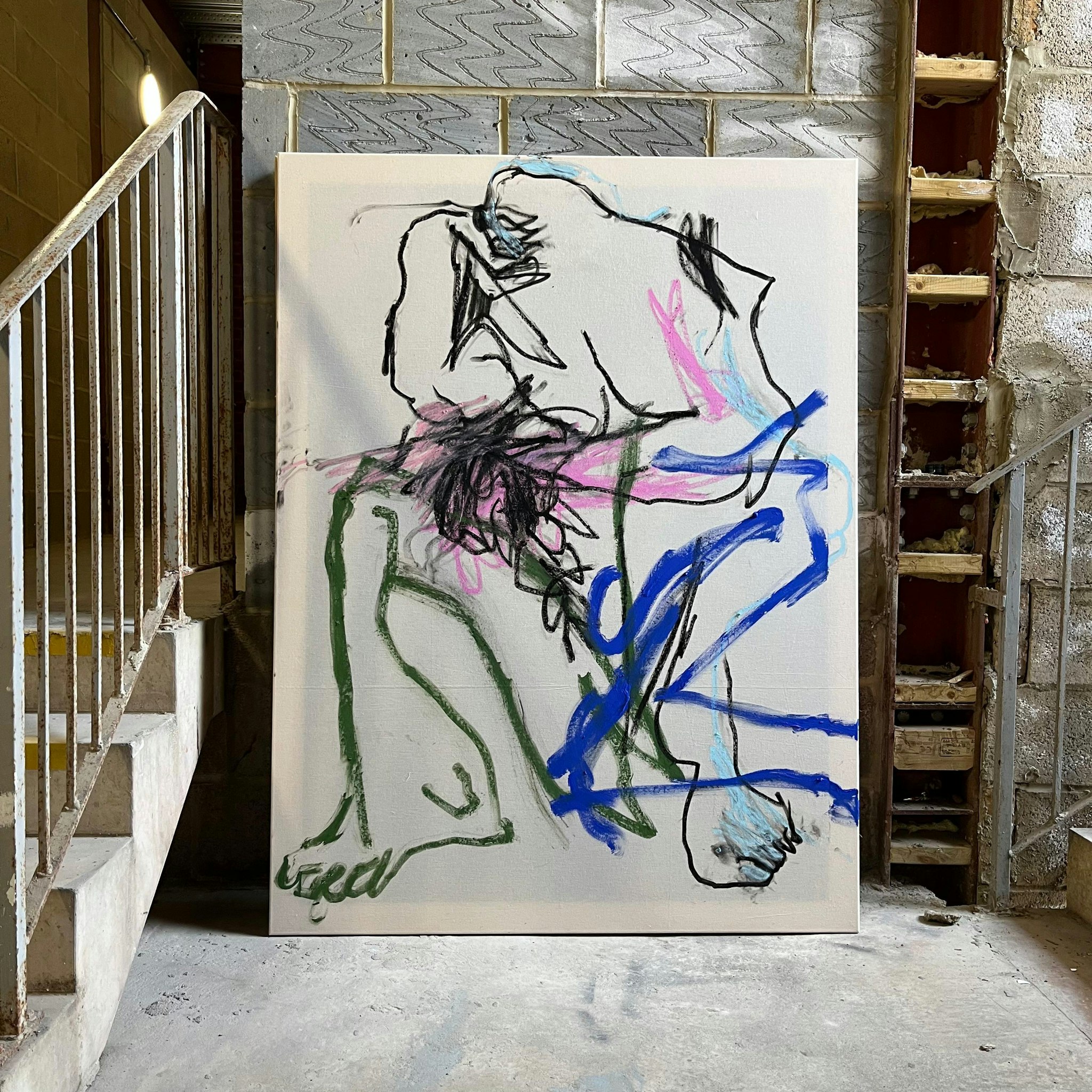 Ben’s background in graffiti and street art shapes a style that moves fluidly between figuration and abstraction. Figures often exist beneath semi-opaque layers of paint or entangled within webs of gestural marks. His use of spray paint carries the immediacy and rhythm of the street directly onto the canvas, capturing both movement and emotion.