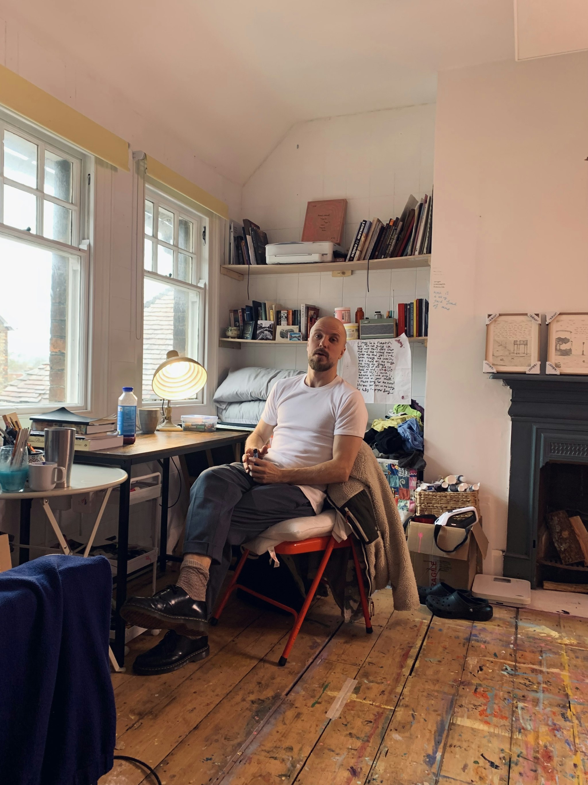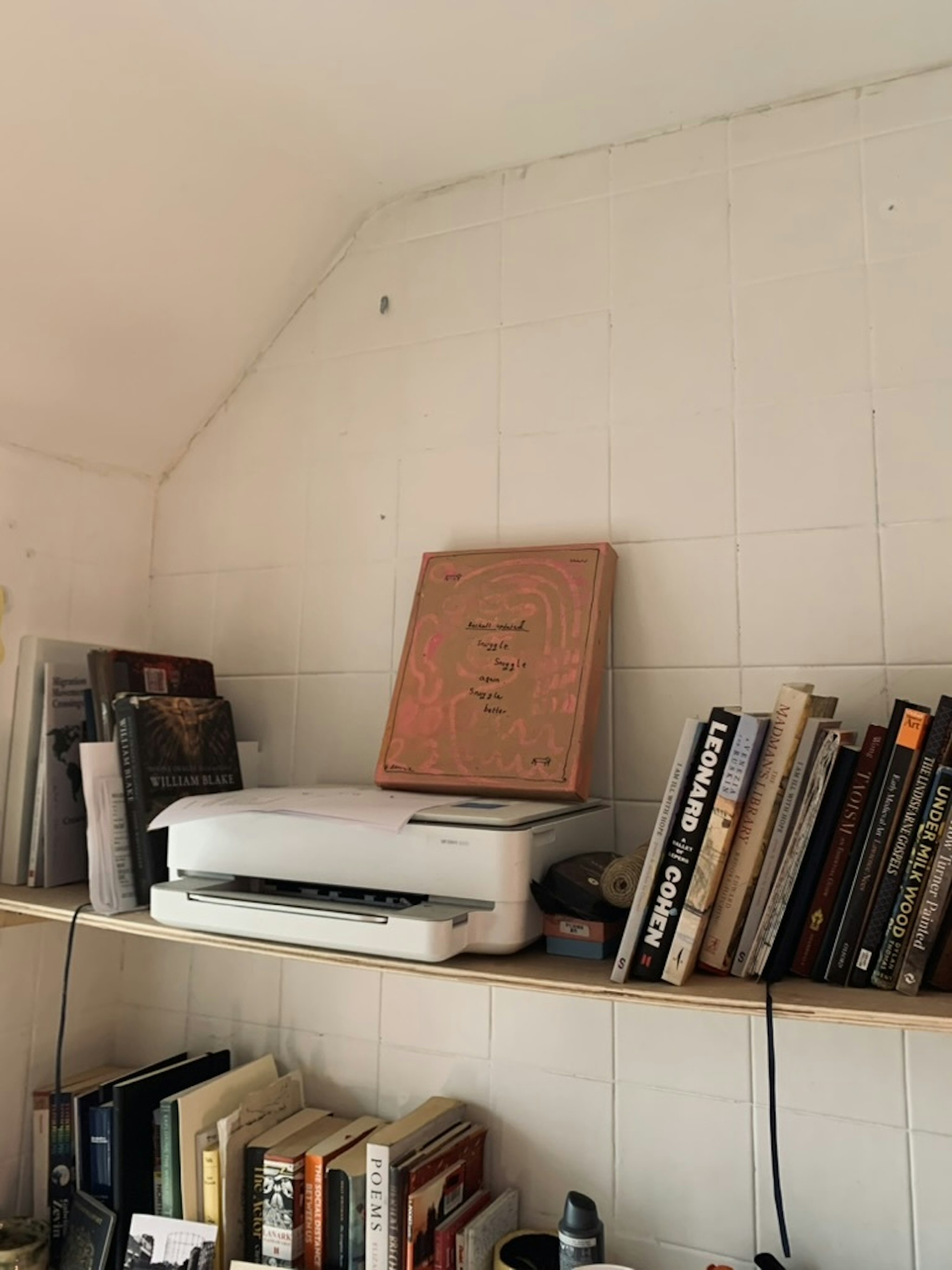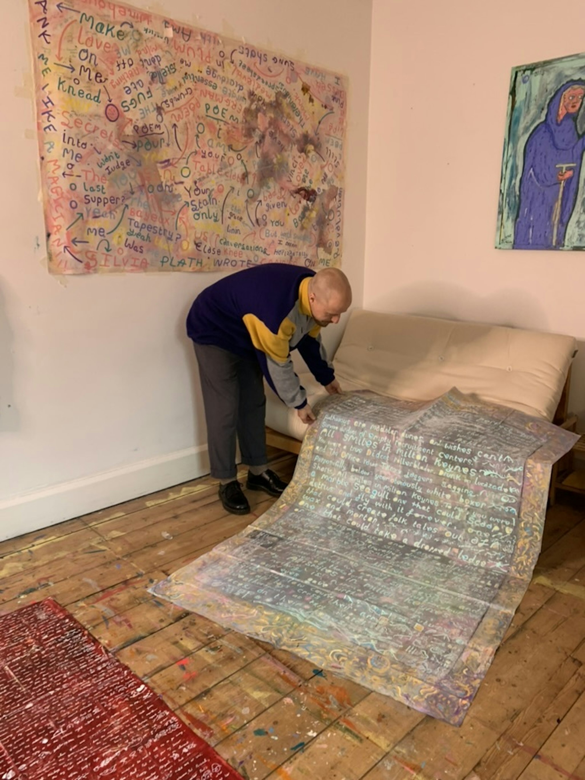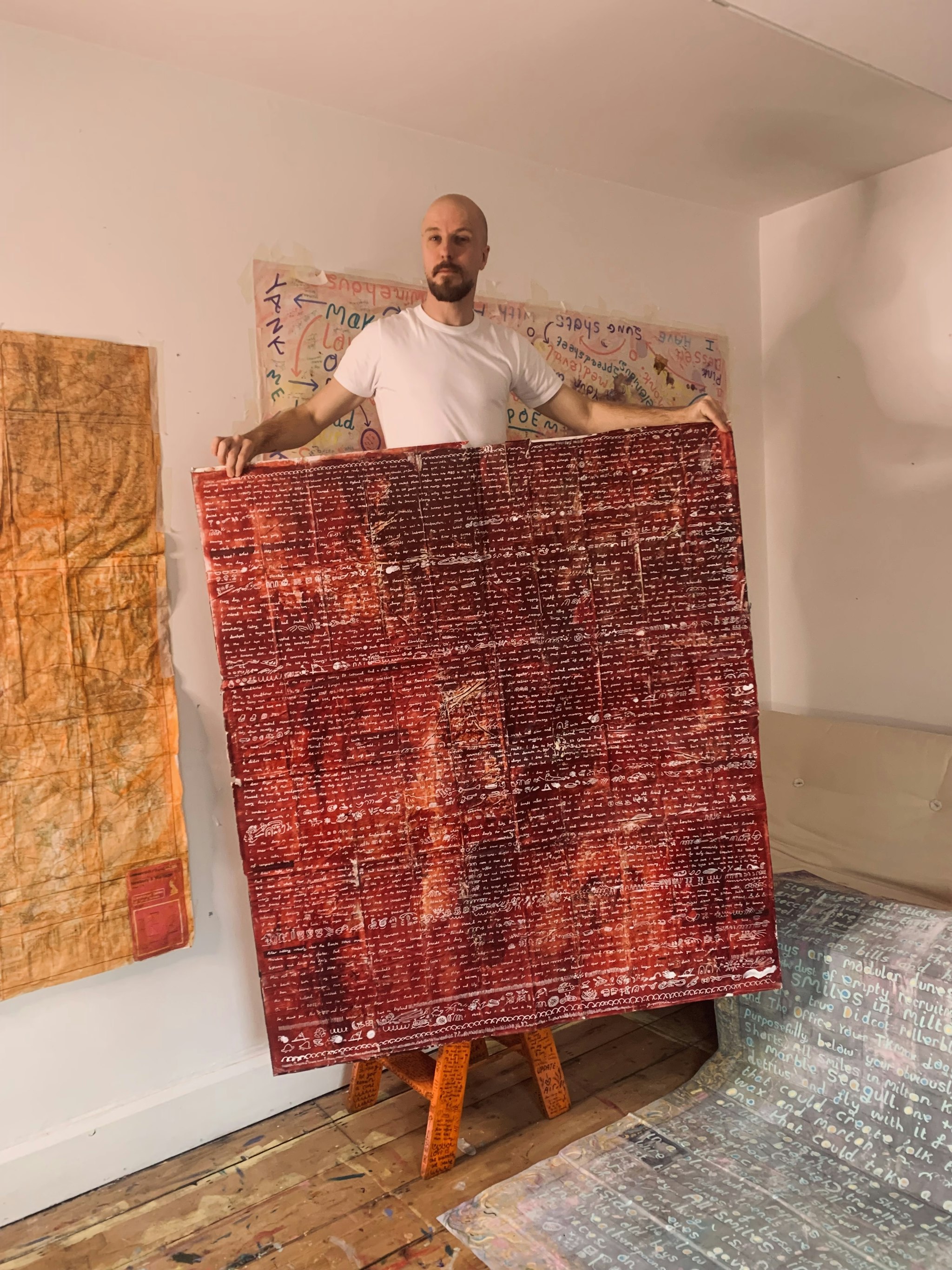 Stepping into his studio feels like stepping into his mind - notebooks, maps, and poems line the walls and floors, with painted fragments of thought in every corner.