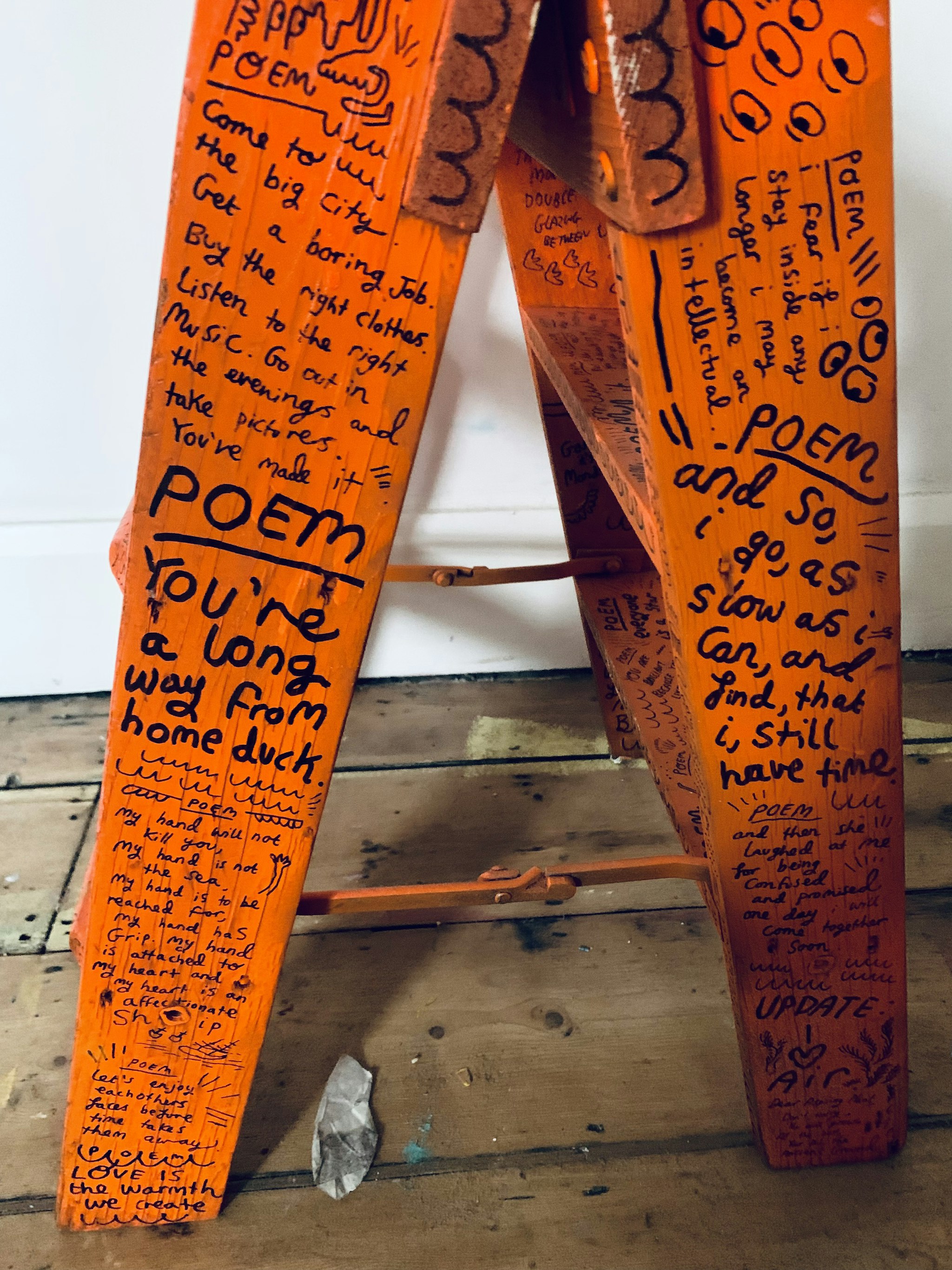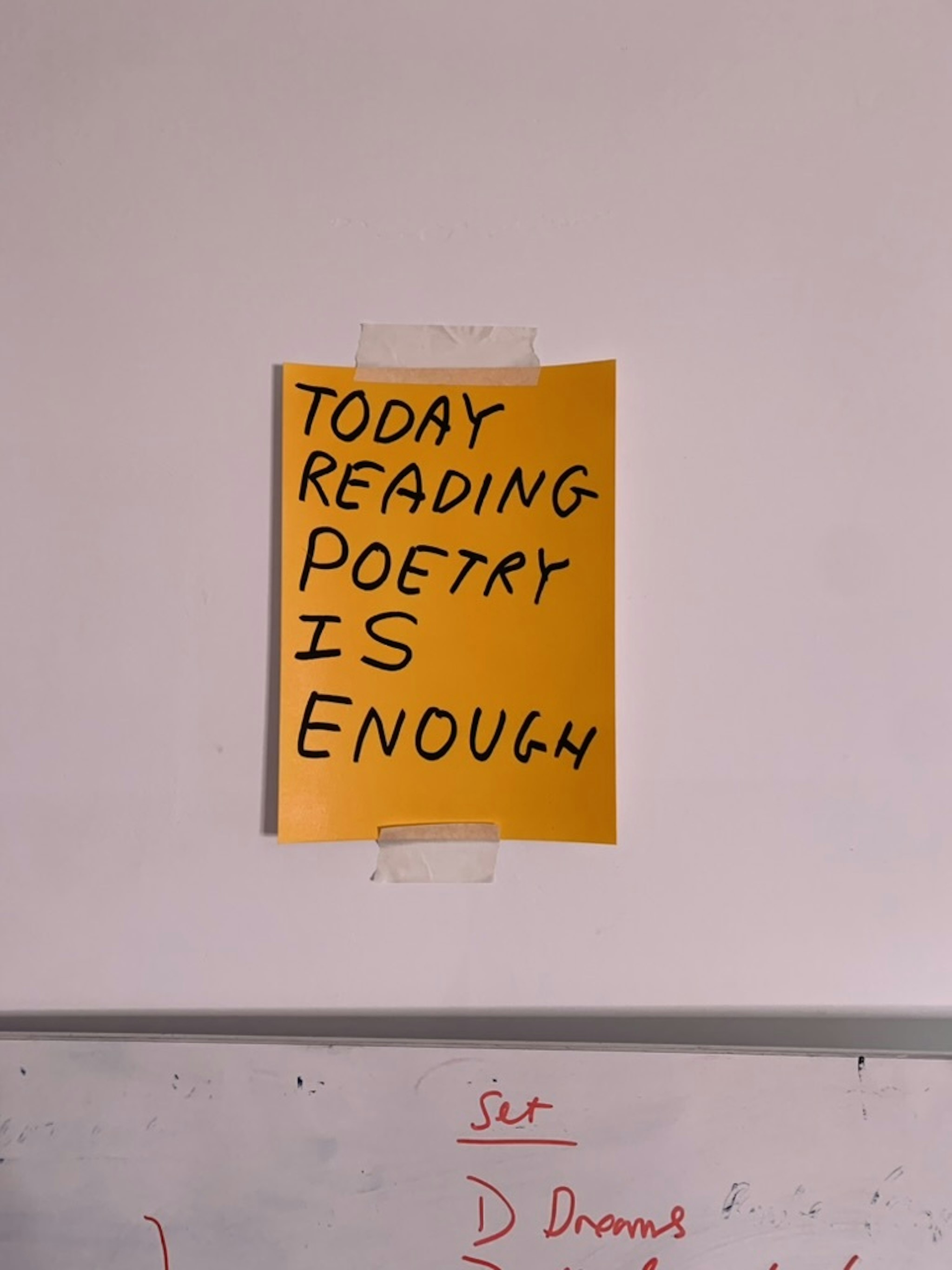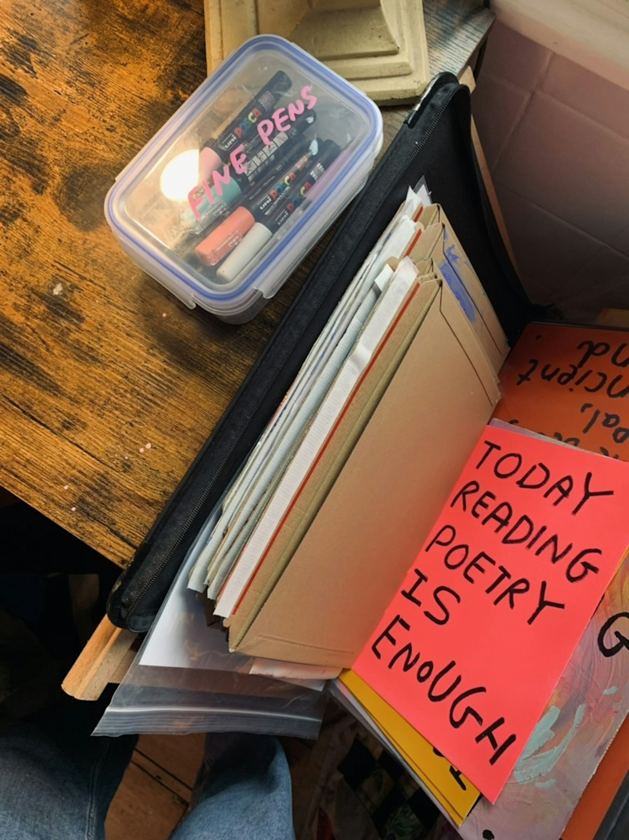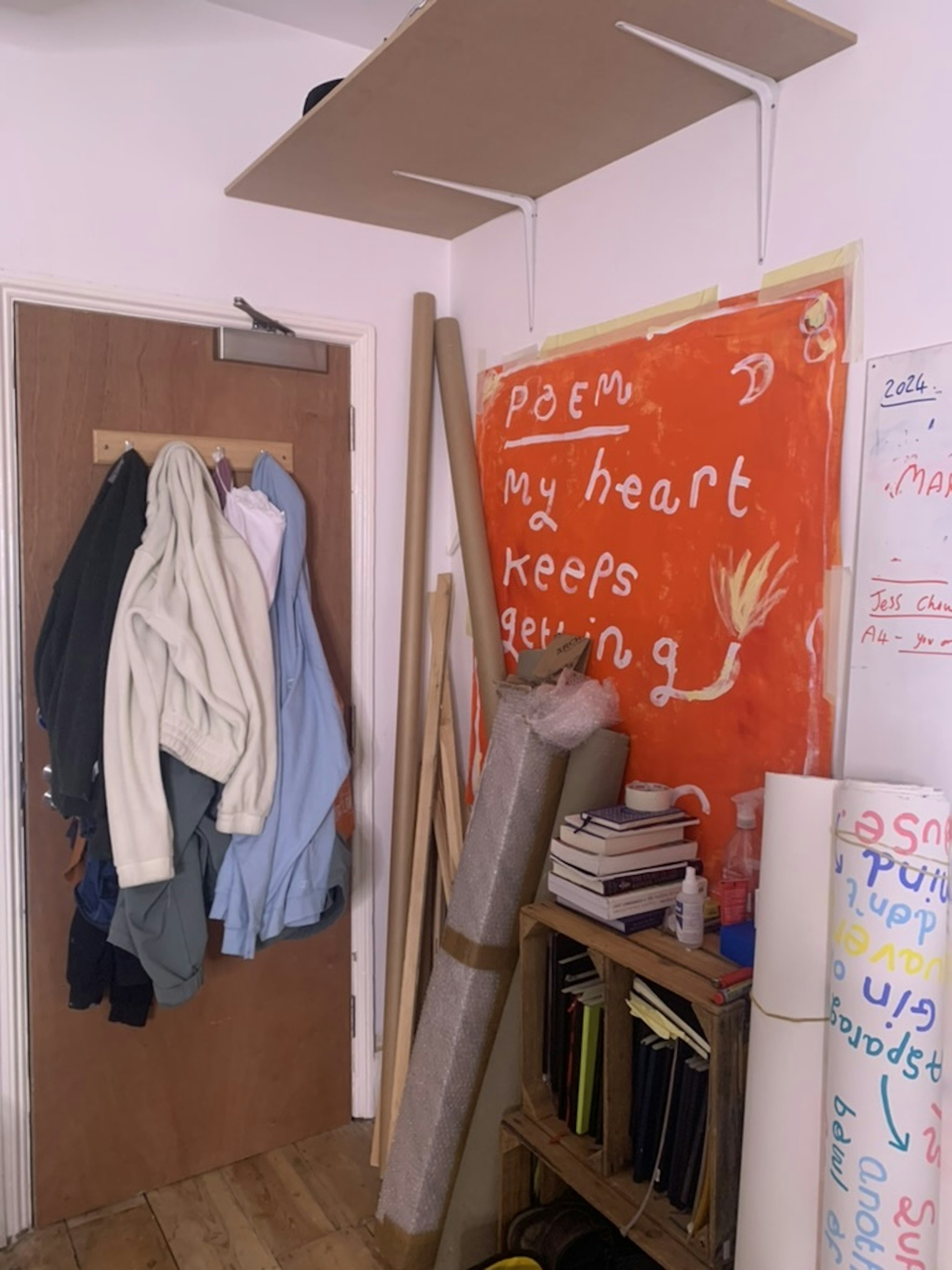 Stepping into his studio feels like stepping into his mind - notebooks, maps, and poems line the walls and floors, with painted fragments of thought in every corner.