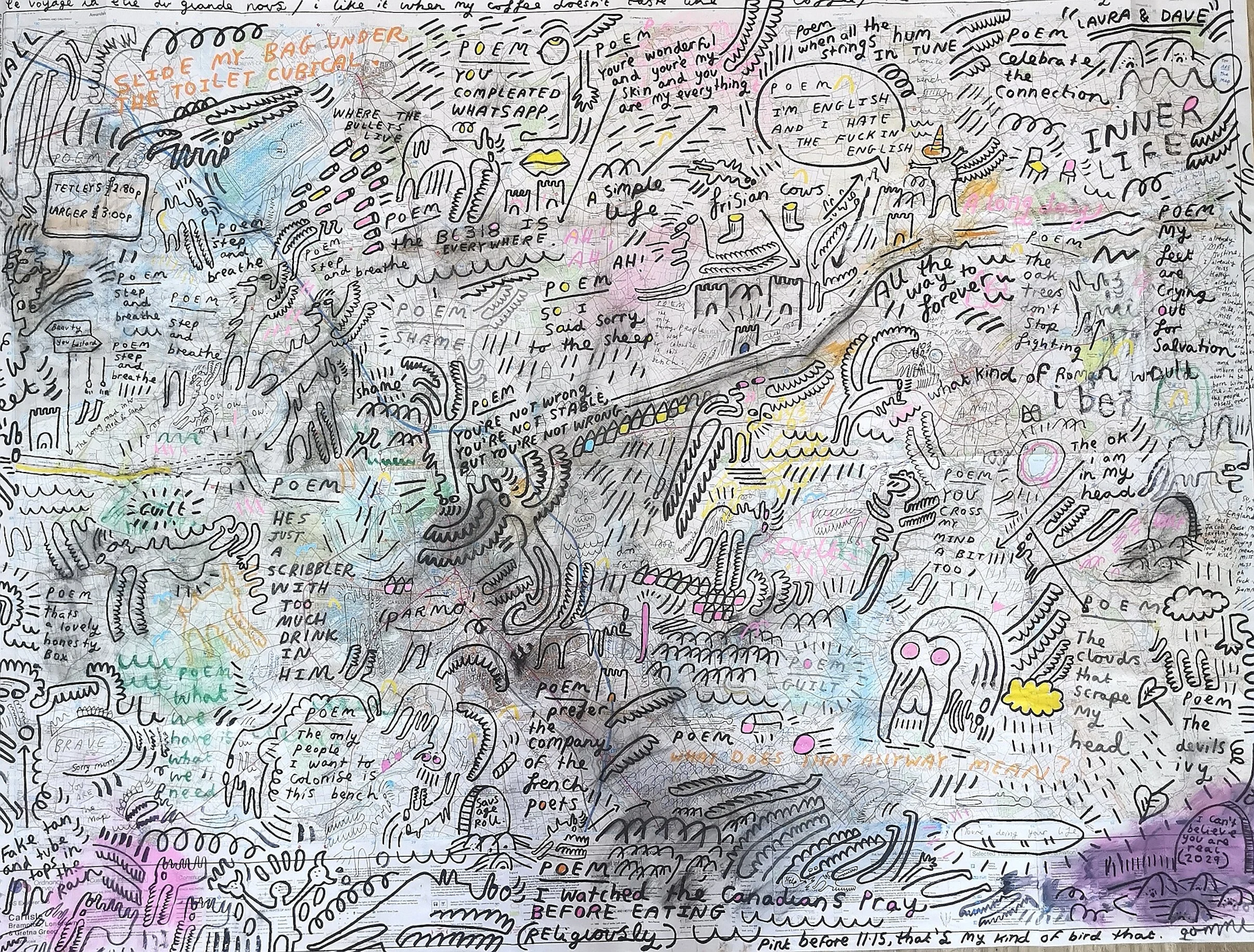 The exhibition at The Art Office was a showcase of his recent work, maps and sketches, including a new series of work titled ‘Overshare’ - a social commentary of 2024 inspired by a trip to London. With over 50 canvases, the series can be viewed as a whole piece, or taken in one by one, poem by poem, poking fun at himself and others with a dark humour and raw honesty.