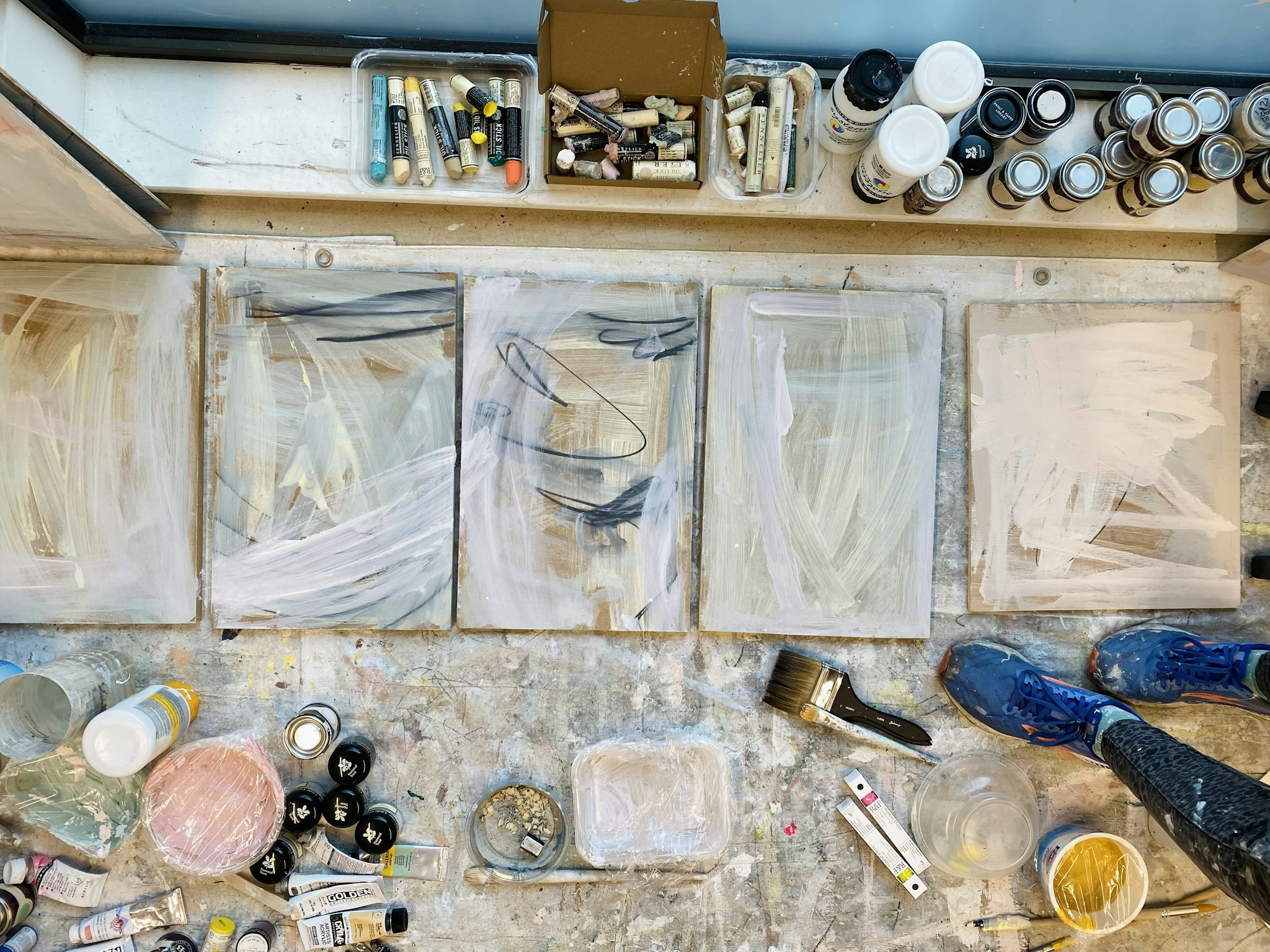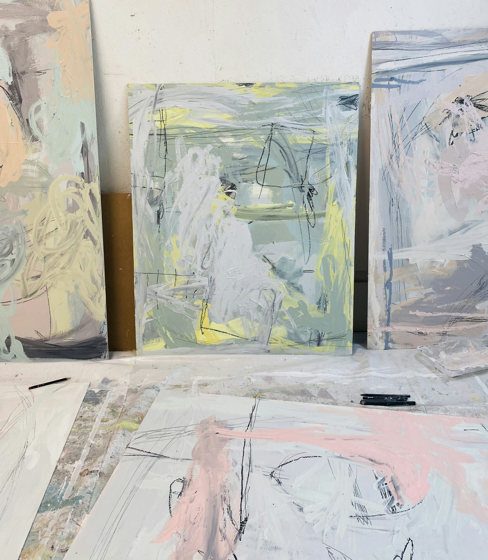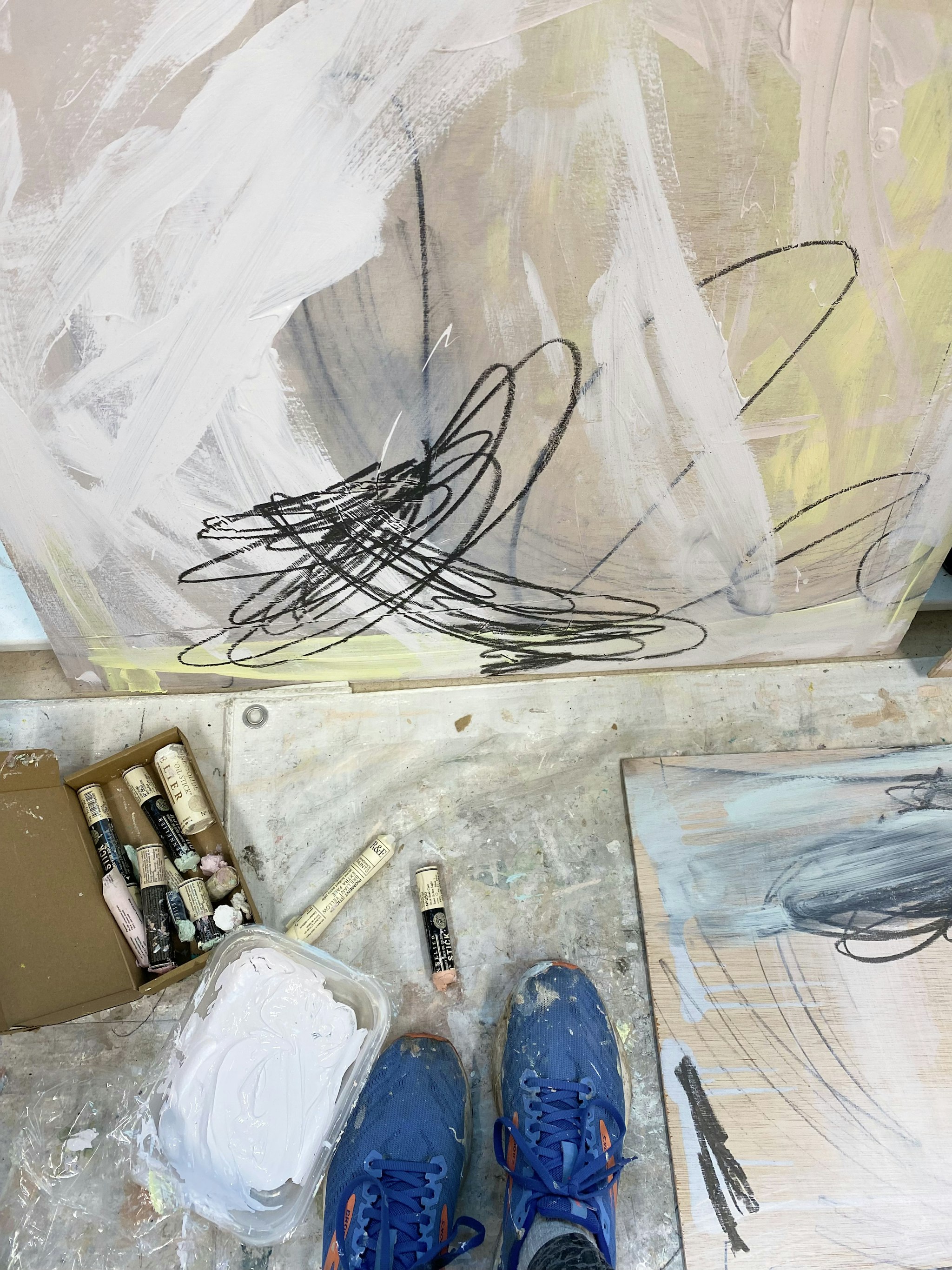 A graduate of Central Saint Martins, UAL, Joanna creates bold abstract works through layers of paint and carbon - raw, tactile reflections on emotion and the evolving human experience. Working directly on the floor of her studio, she moves instinctively between canvases, using sweeping gestures and thick strokes of paint and graphite to build dynamic, emotionally charged surfaces.