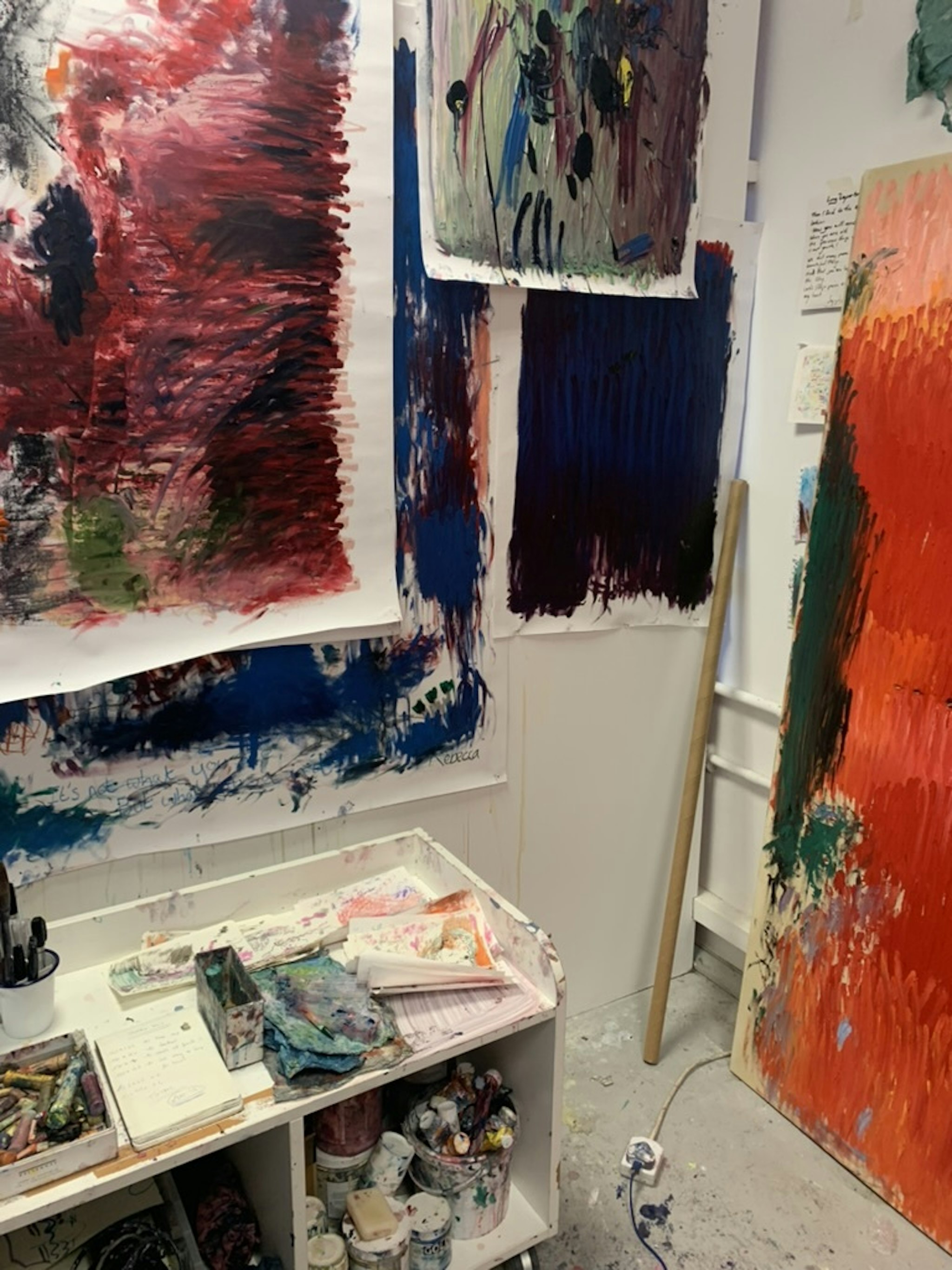 The large-scale works featured in the exhibition are pure, physical expressions of emotion, captured in the moment of their making. Through sweeping gestures and uncensored mark-making, Rebecca constructs dynamic compositions that invite the viewer’s eye to travel across the canvas - following a narrative that unfolds in movement, rhythm and form.