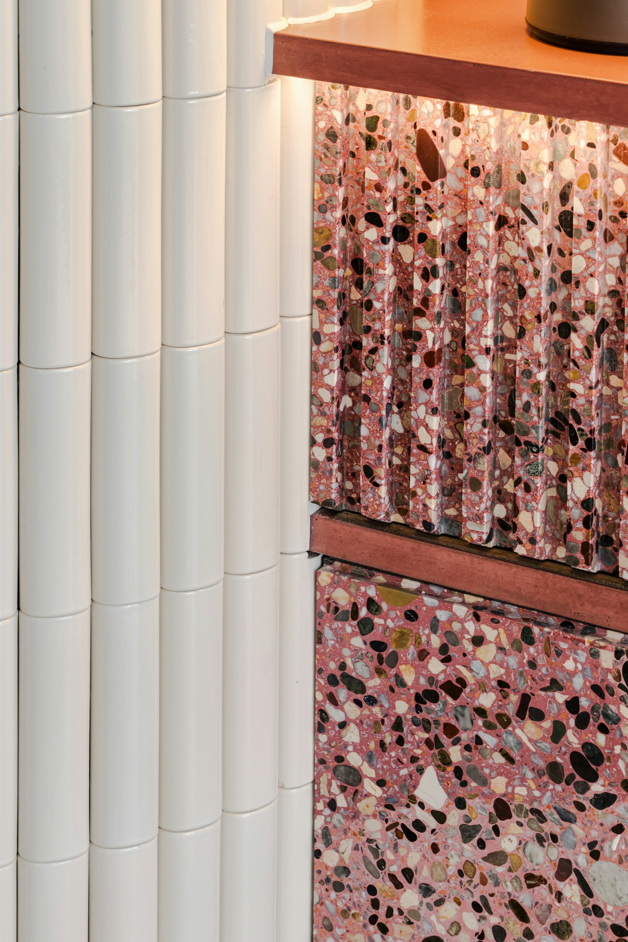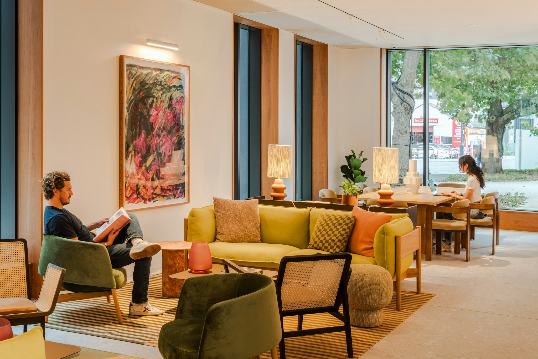 - Series of prints by Marcelina Amelia for the residential corridors. The prints chosen primarily feature a single figure either reading or seated beside a stack of books. The books carry titles that evoke themes of self-reflection and self-care, such as How to Live, Detox, Work and Life Balance, and I Only Want Everything.
