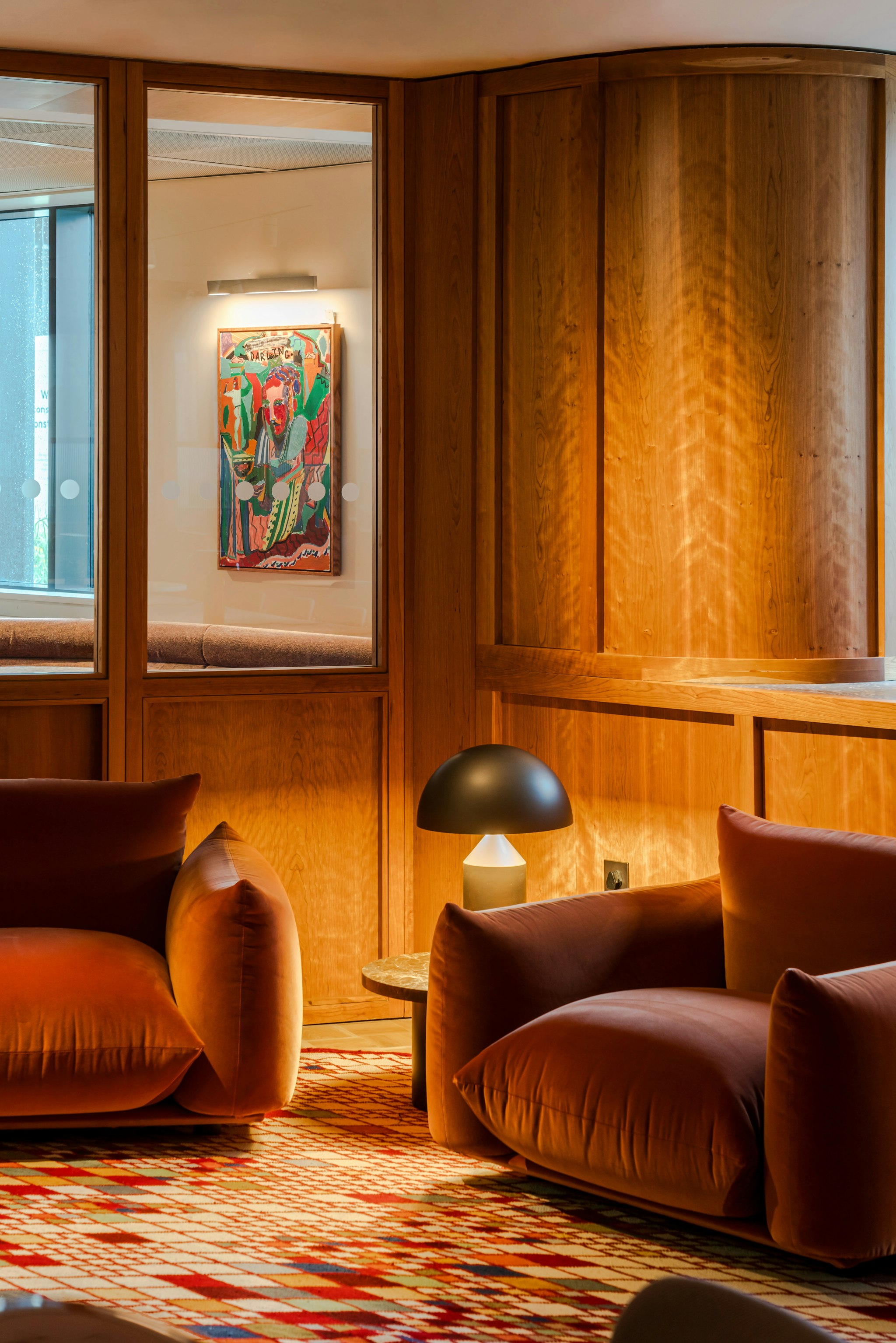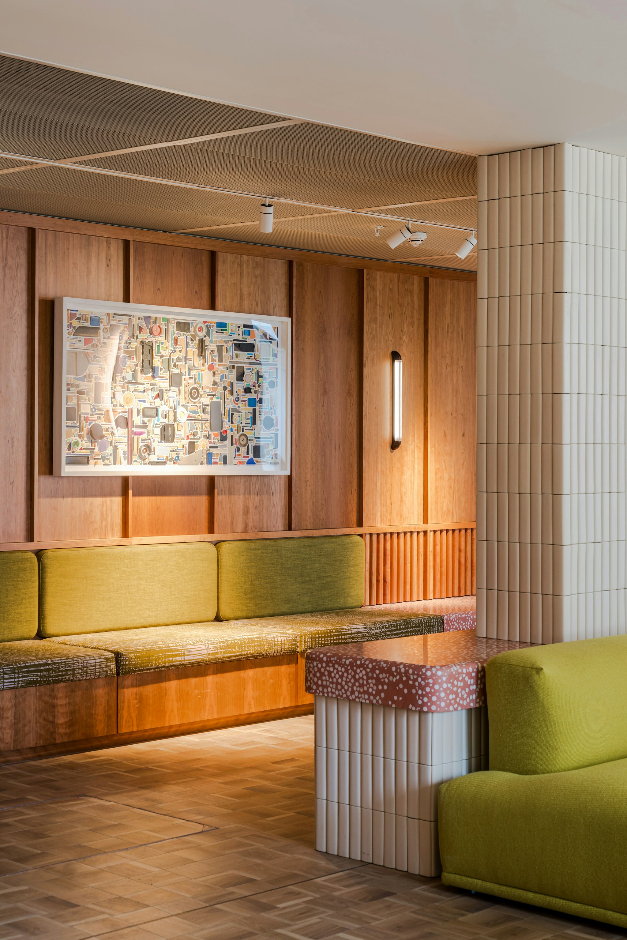 Our goal for Arthur House was to curate an art collection that transformed the communal spaces, encouraging students to socialize and connect. Pieces were carefully chosen to complement the natural materials of the interior design, whilst bringing bold colours, fun and energy fitting for student living. A series of prints and posters for the ground floor corridors celebrate the area’s rich history in music, sport, and culture, from vintage 1920s Wembley football and rugby posters, to modern arena tour posters and the London Olympics.