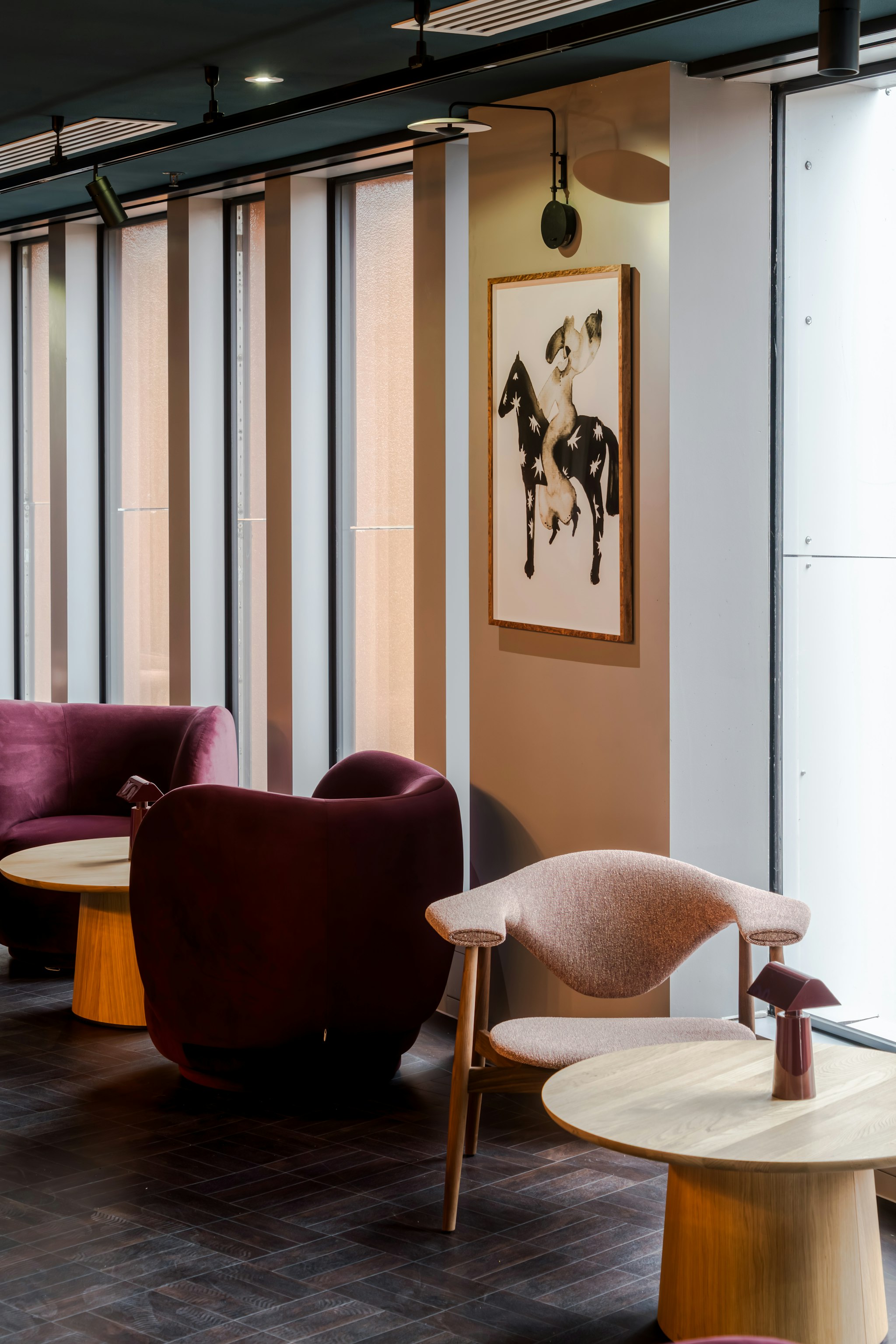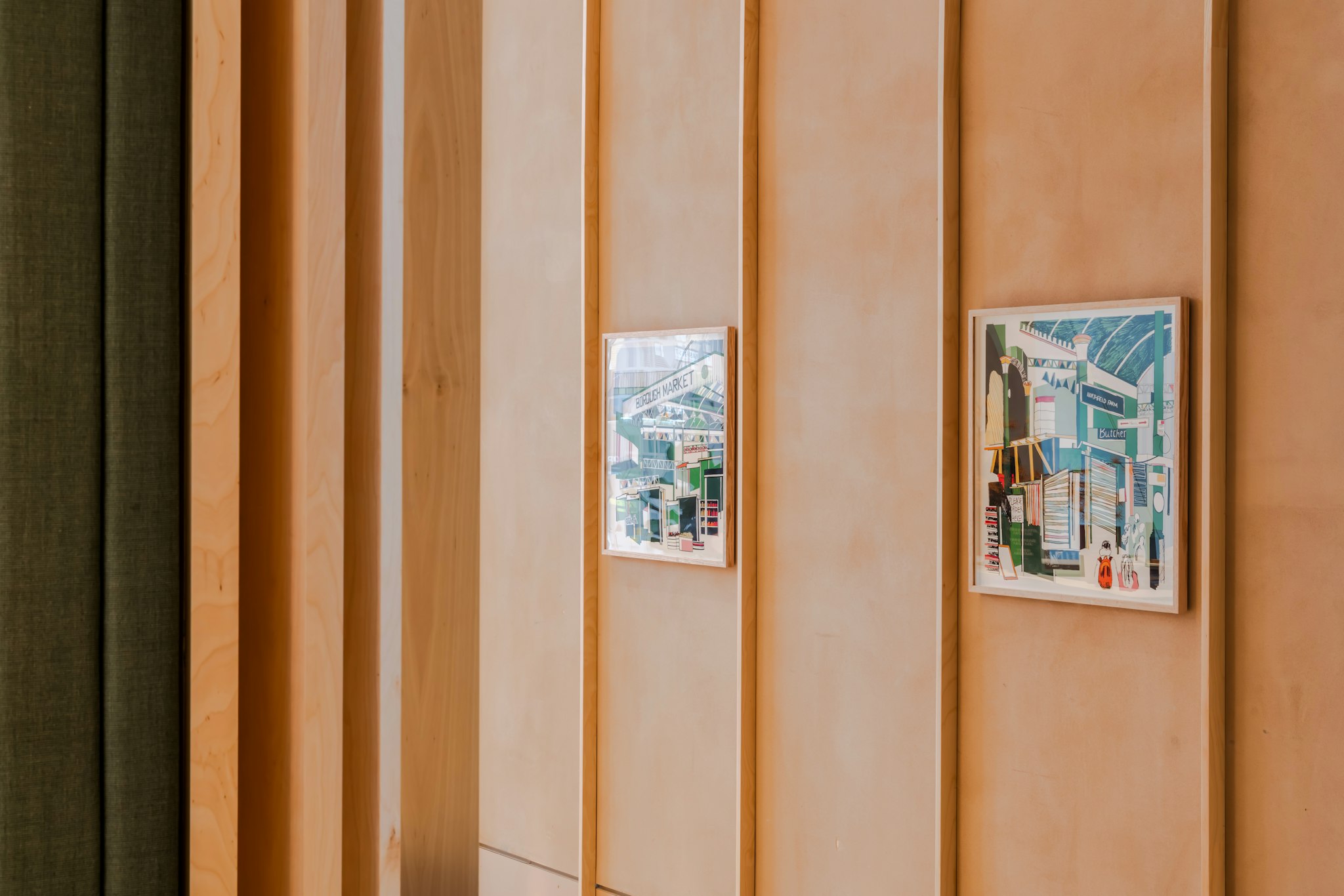 The collection highlights the work of numerous local artists and spans a wide range of styles, from playful posters and graphic prints to large-scale abstract paintings, capturing the eclectic, creative spirit of the neighbourhood and bringing it into every corner of the building.