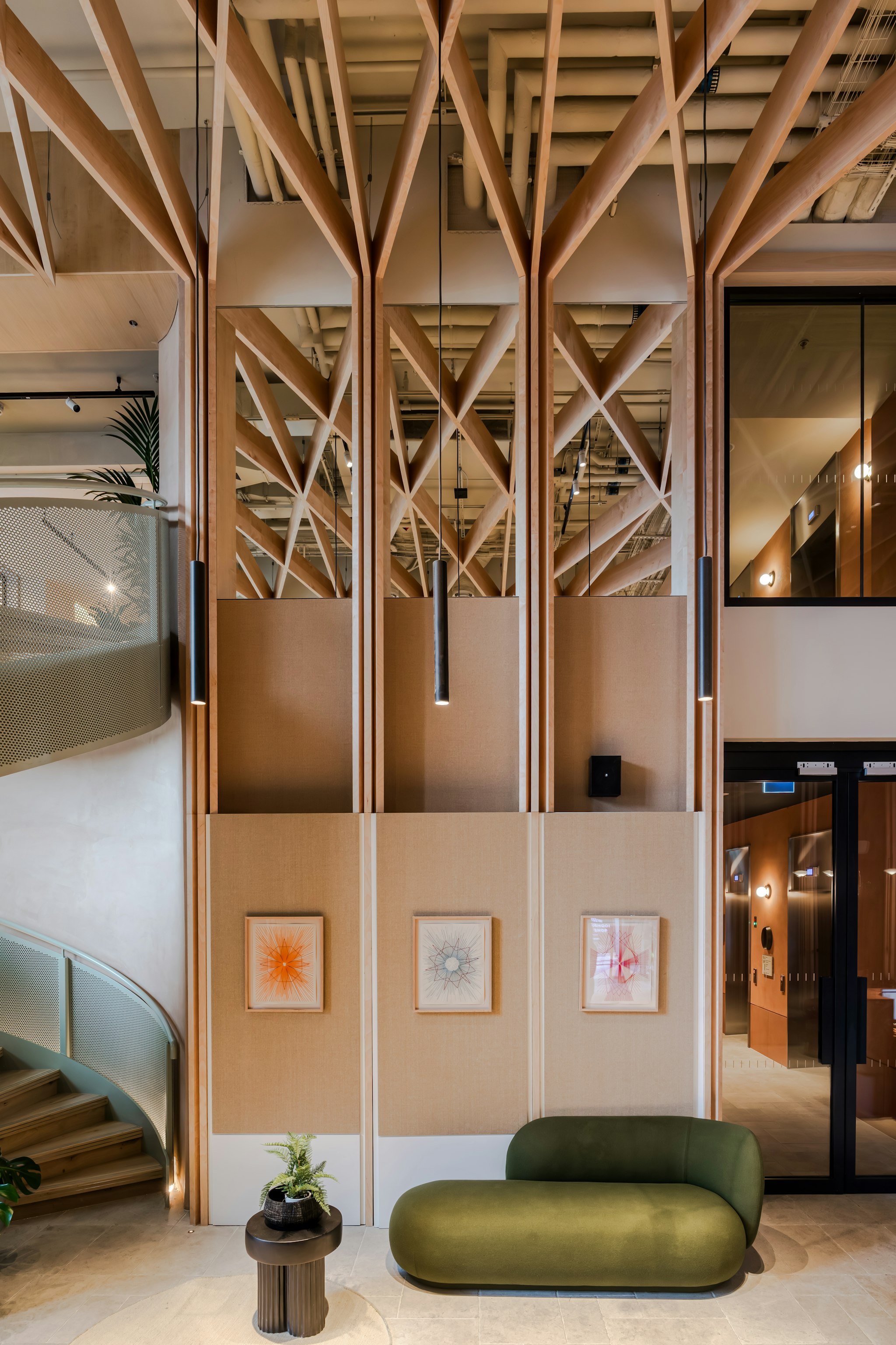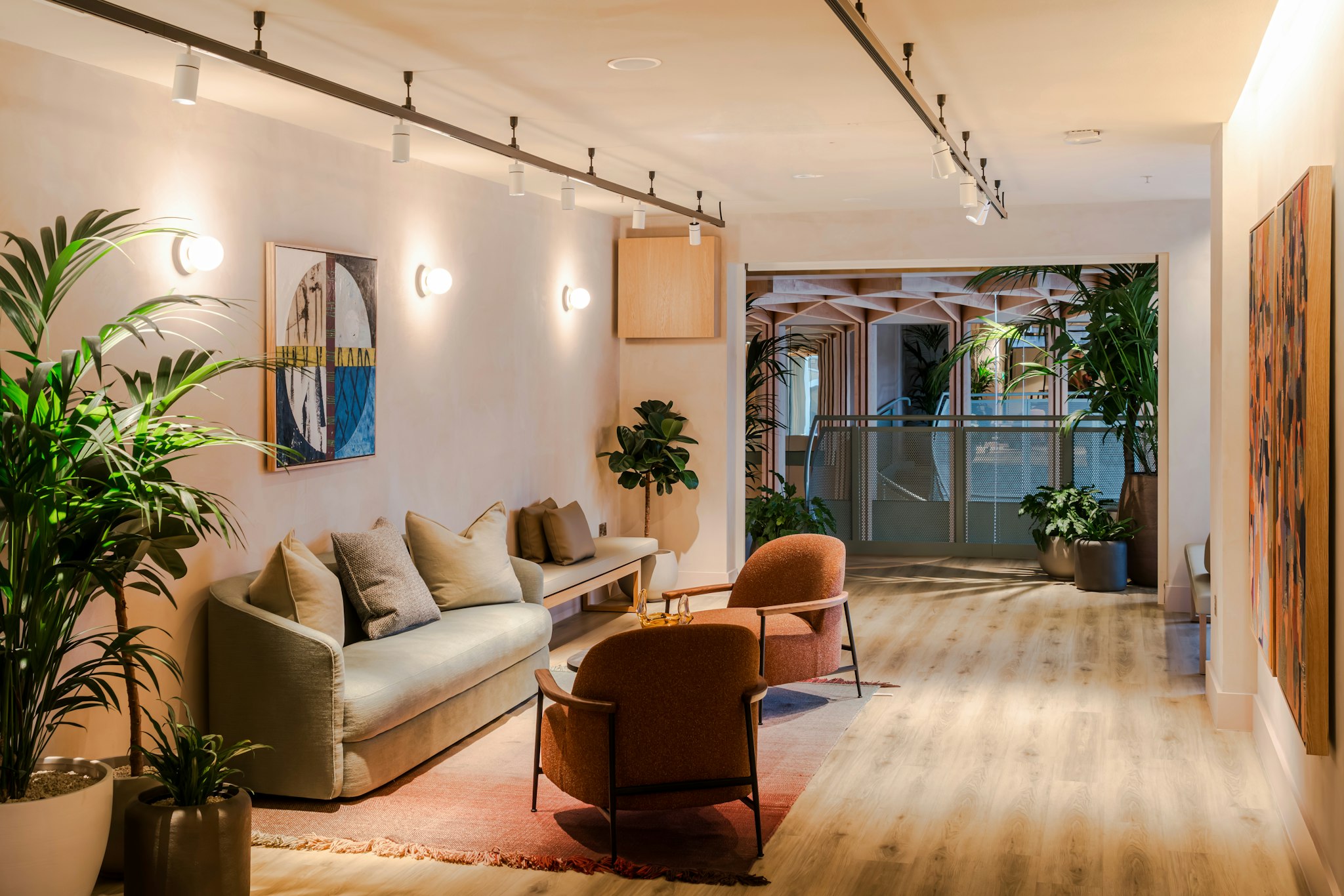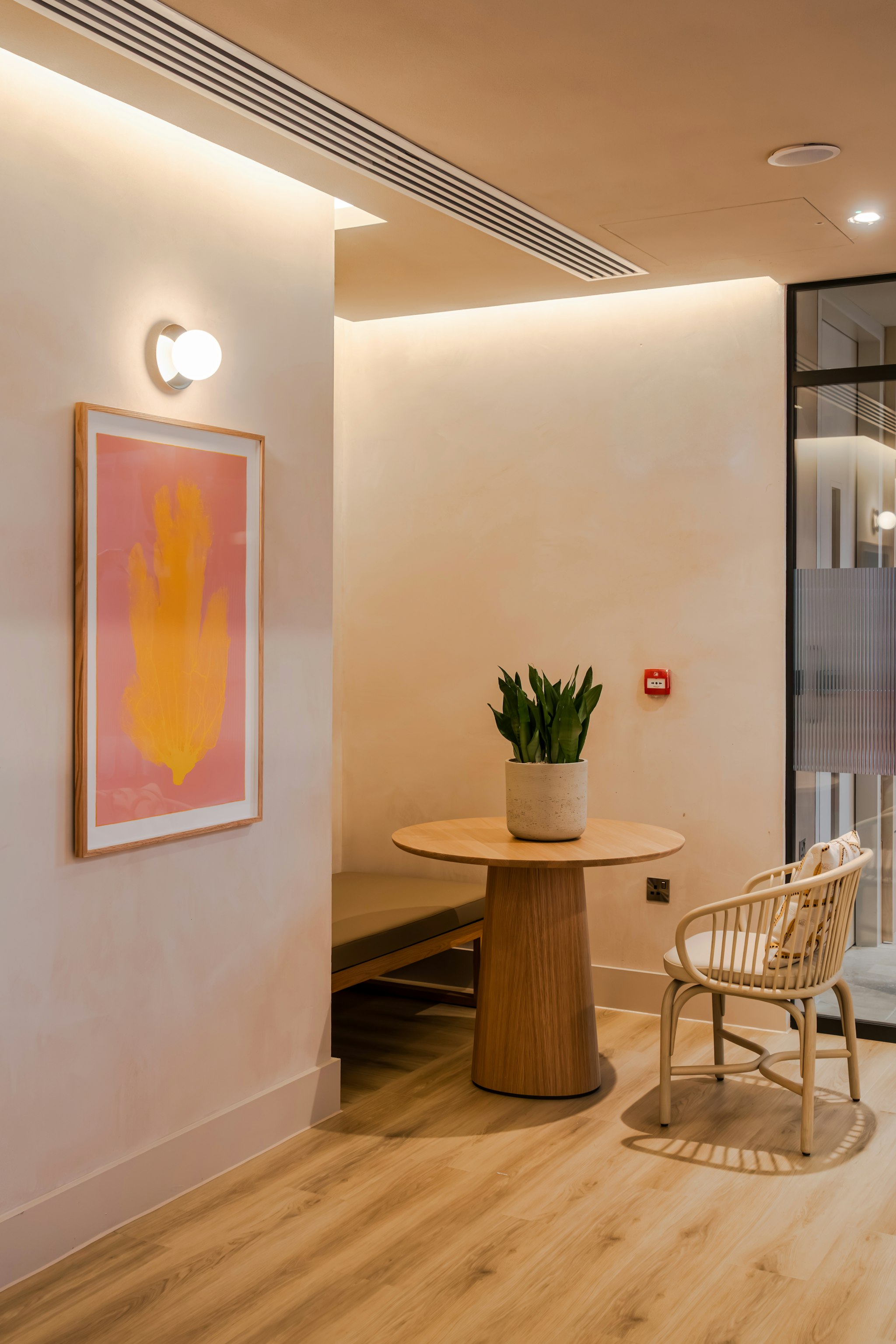 - 3 bespoke hand stitched embroidery artworks by London artist Holly Allan in the reception area. Holly’s work often intertwines natural motifs with architectural elements, celebrating both human creativity, urban renewal and nature’s enduring presence.
